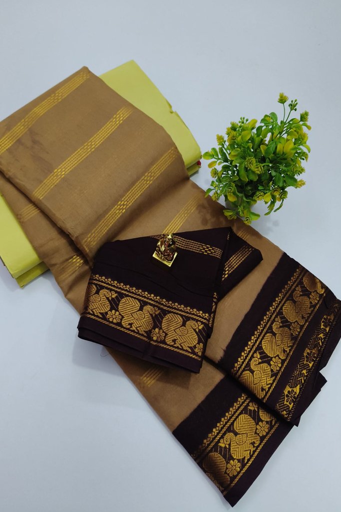 Elegant Bottle Green Kalyani Cotton Saree with Mustard Yellow Zari Border