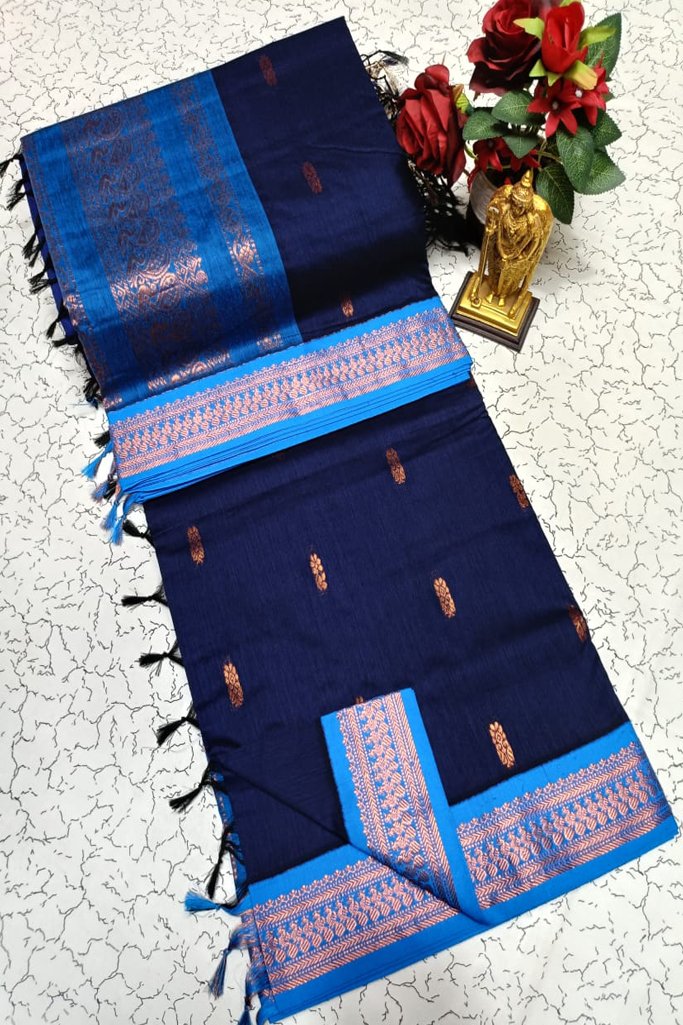 Elegant Navy Blue Kalyani Cotton Saree with Sky Blue Zari Border