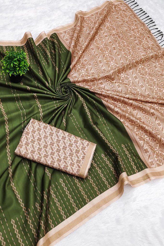 Elegant Bottle Green Khadi Cotton Saree with White Floral Print & Tassel Pallu
