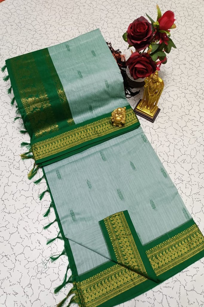Elegant Pastel Blue Kalyani Cotton Saree with Green Zari Border