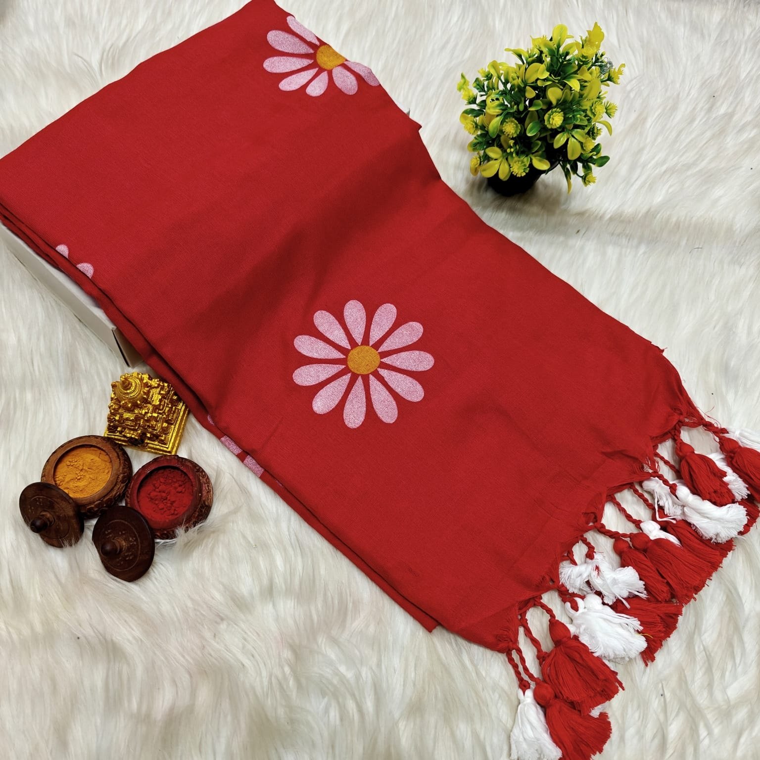 Elegant Red Khadi Cotton Saree with White Floral Print & Tassel Pallu
