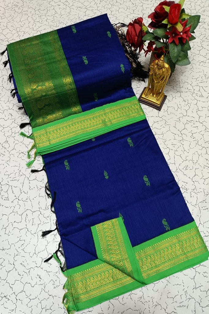 Elegant Royal Blue Kalyani Cotton Saree with Green Zari Border & Butti Design