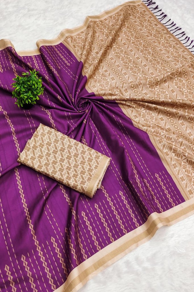 Elegant Wine Purple Khadi Cotton Saree with White Floral Print & Tassel Pallu